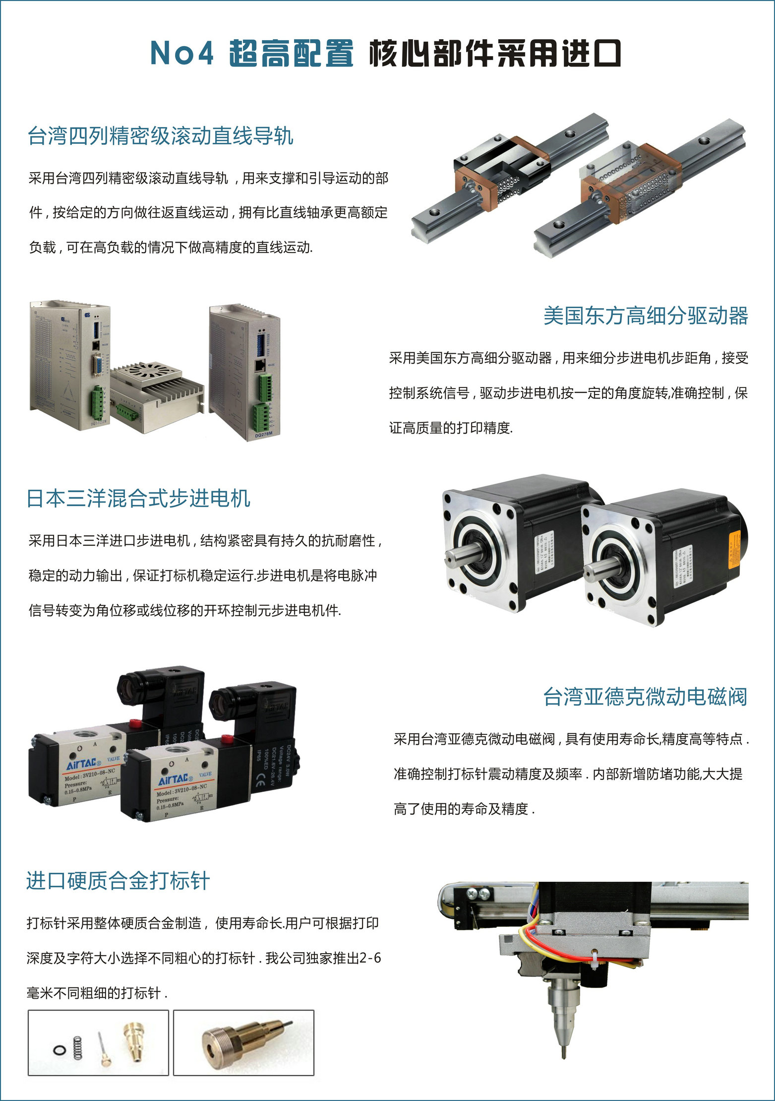配置说明:关键部件均采用进口元件,台湾四列精密级滚动直线导轨,日本三洋步进电机,日本欧姆龙触发式传感器关,台湾亚德克微动电磁阀。